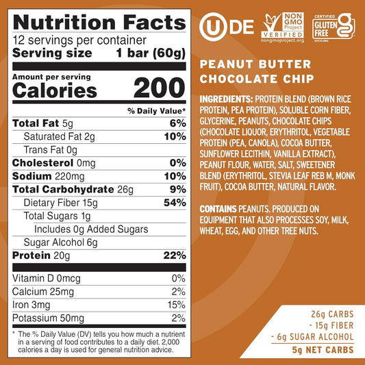 High Protein Bars, Peanut Butter Chocolate Chip - Healthy Snacks, 20G Vegan Protein, High Fiber, Low Sugar, Dairy & Gluten Free (12 Count)